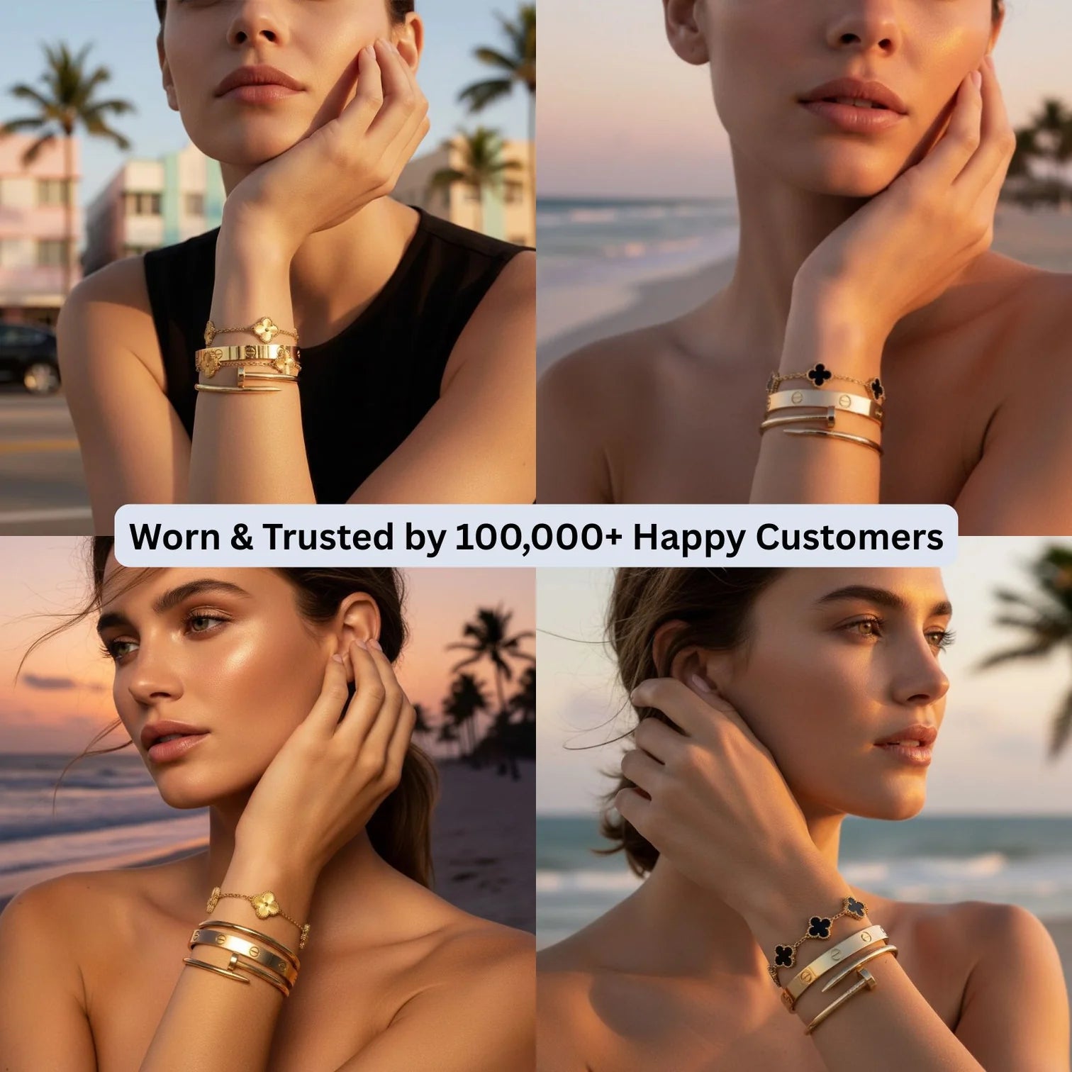 Each piece is completely waterproof, tarnish-free, and designed to never lose its colour — made with real 18k gold plating for everyday wear.