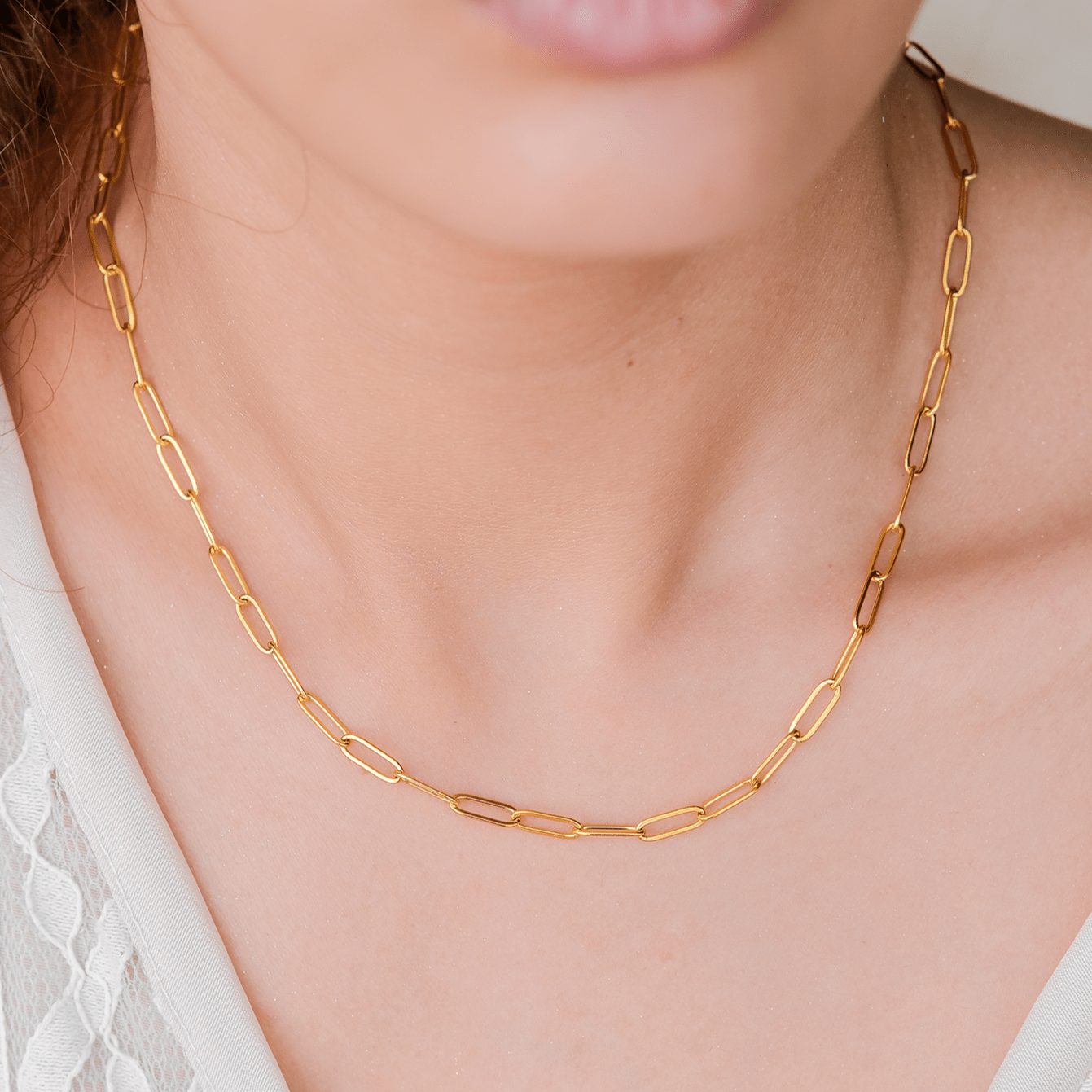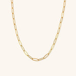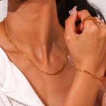 This gold necklace combines a timeless style with a contemporary flair. The necklace features chain-connected links that form a smooth and graceful curve around your neck. Best paired with Lena Golden Chain Bracelet.