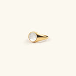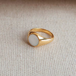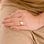 The Mother Of Pearl. A stunning ring that exhibits an ever-so-flawless freshwater pearl set in a delicate band of gold. Easily a timeless symbol of elegance and grace.