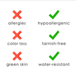 - Water, Sweat, and Heat Resistant. (No discoloration, No Tarnishing).